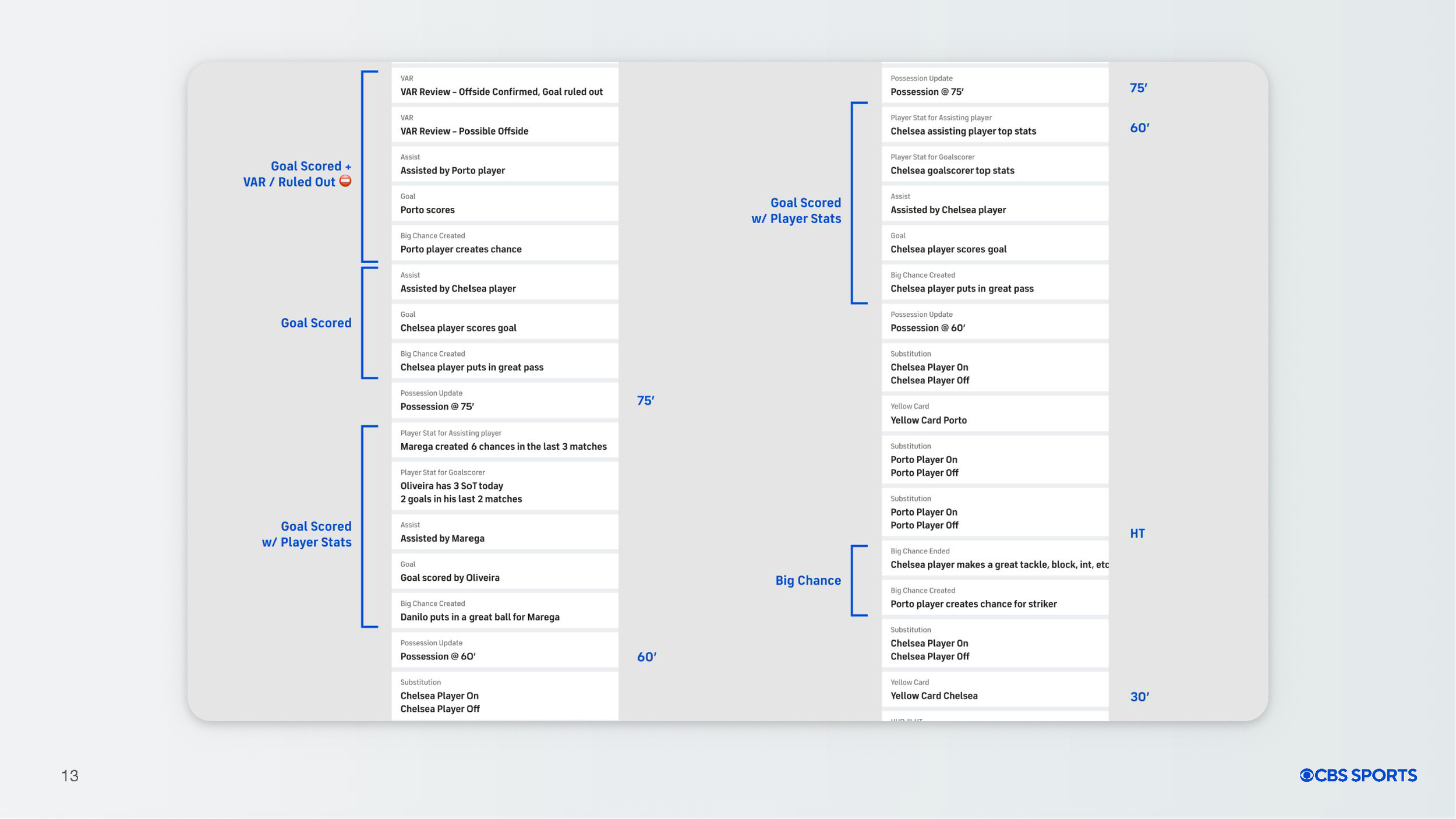 Following the acquisition of UEFA Champions League live rights, CBS Sports needed a soccer experience that stood apart. The market leaders we audited — FotMob, Premier League, ESPN, and NBC Sports — largely presented soccer through text heavy play by play lists. These feeds are useful, but they rarely feel alive. They deliver moments as sentences rather than as events you can feel.